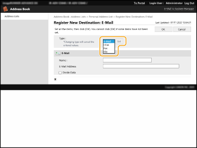 [Personal Address List/User Group Address List Settings], en schakel het selectievakje [Apply User Group Name Change to User Group Address List Name] in. [Apply User Group Name Change to User Group Address List Name] is alleen beschikbaar wanneer persoonlijke-verificatiebeheer is ingeschakeld.