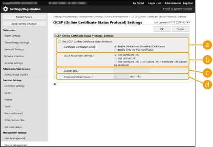 Er zijn twee methoden om te controleren of certificaten die tijdens de communicatie met een andere partij zijn ontvangen, geldig zijn: Vergelijken met de certificaatintrekkingslijst (CRL) die op de machine is geregistreerd en een OCSP (online certificate status protoco)-responder opvragen (een server die OCSP ondersteunt). Stel de methode in voor het controleren van de vervaldatum van certificaten conform uw omgeving. Deze registratie kan alleen worden uitgevoerd door de beheerder.