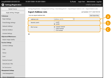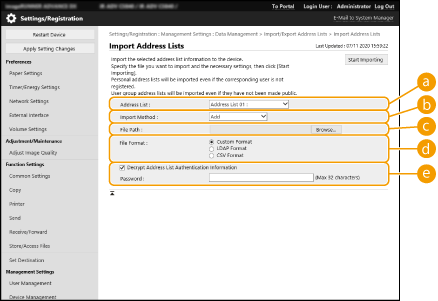 U kunt specifieke instellingen selecteren om te importeren of te exporteren, zoals adressenlijsten in het adresboek of printerinstellingen. Beheerdersbevoegdheden zijn nodig om deze bewerkingen uit te voeren.