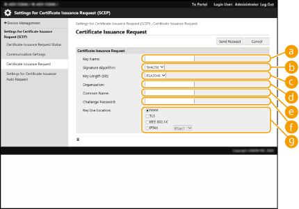 Een verzoek tot uitgifte van het certificaat dat nodig is voor sleutels die met de machine worden gegenereerd, kan worden verzonden naar een SCEP-server (Simple Certificate Enrollment Protocol) die certificaten beheert. Certificaten die vanaf de SCEP-server worden uitgegeven, worden automatisch op de machine geregistreerd. U kunt alleen een verzoek tot uitgifte van een certificaat verzenden als u Administrator-bevoegdheden hebt.