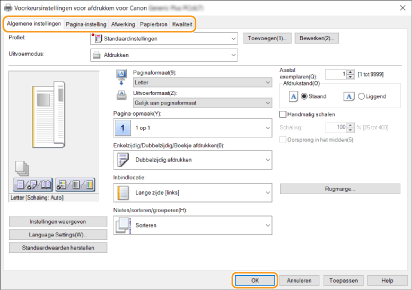 Schakel zo nodig tussen de tabbladen om de gewenste afdrukinstellingen op te geven.