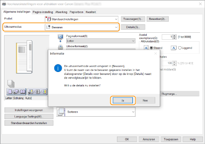 Selecteer [Bewaren] uit [Uitvoermodus] en klik op [Ja].