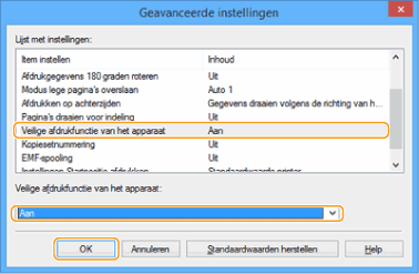 Selecteer [Aan] bij [Veilige afdrukfunctie van het apparaat] en klik op [OK].