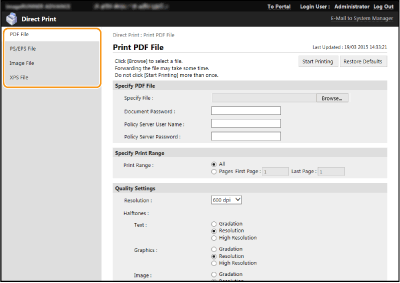 voer het wachtwoord in [Document Password]. Voor het afdrukken van PDF-bestanden die zijn gekoppeld aan de beleidsserver, selecteert u [Specify PDF File]