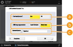 De exclusieve community is een community (groep) die is voorbereid voor managers die Canon-software, zoals iW Management Console, gebruiken. Om de exclusieve community te gebruiken, drukt u op <Stel speciale community in>. Om een algemene community op te geven, drukt u op <Stel community naam 1 in> of <Stel community naam 2 in>.