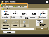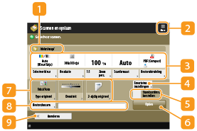 Wanneer u op <Scannen en opslaan> drukt in het <Home> en vervolgens op <Postbus>, <Geavanceerde ruimte>, <Netwerk> of <Geheugenmedia> drukt om originelen te scannen, wordt het volgende instellingenscherm weergegeven.