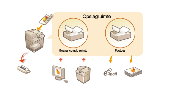 Het opslaggapparaat in de machine heeft "opslagruimte" waarin gescande documenten kunnen worden opgeslagen, gedeeld en bewerkt. Als u geheugenmedia op de machine aansluit, hebt u ook een externe opslagruimte. Zoek en gebruik de ideale opslagruimte voor uw behoeften.