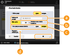 Para utilizar a função de autenticação do servidor proxy, carregue aqui e configure as informações de autenticação. No ecrã apresentado, carregue em <Ligado>, introduza o nome de utilizador e a palavra-passe a utilizar na autenticação do proxy e carregue em <OK>.