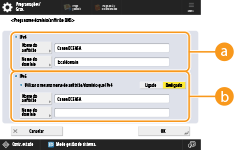 Para programar os mesmos nomes de anfitrião e de domínio que o IPv4, carregue em <Ligado> na opção <Utilizar o mesmo nome de anfitrião/domínio que IPv4>. Para programar nomes diferentes do IPv4, carregue em <Desligado>.