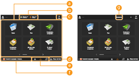 В зависимости от режима и состояния использования устройства отображаются кнопки трех приведенных ниже типов (слева направо). Обратите внимание, что доступность кнопок зависит от модели и установленного дополнительного оборудования.