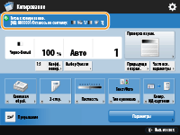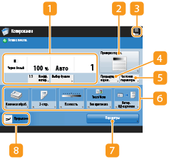 В этой области отображается настроенное значение, например коэффициент масштабирования, формат бумаги и количество копий. Подтвердите параметры, чтобы копирование было выполнено должным образом. Для изменения значений нажмите кнопку, расположенную под этой областью. Основные операции копирования