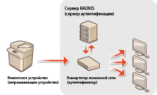 В сети, где используется аутентификация IEEE 802.1X, несанкционированный доступ блокируется коммутатором локальной сети (аутентификатором), который предоставляет доступ только тем клиентским устройствам (запрашивающим устройствам), которые прошли проверку подлинности на сервере аутентификации (на сервере RADIUS). Чтобы подключить аппарат к сети IEEE 802.1X, на нем необходимо настроить соответствующие параметры, такие как используемый сервером способ аутентификации. Для настройки соответствующих параметров требуются полномочия администратора или администратора сети.