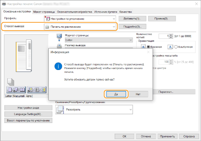 В раскрывающемся списке [Способ вывода] выберите пункт [Печать по расписанию] и нажмите кнопку [Да].