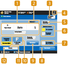 Служит для отображения состояний параметров, таких как формат бумаги для печати и количество экземпляров. Подтвердите параметры, чтобы печать была выполнена должным образом. Для изменения значений нажмите кнопку, расположенную под этой областью. Чтобы изменить количество экземпляров для печати, введите нужное число с помощью цифровых клавиш.