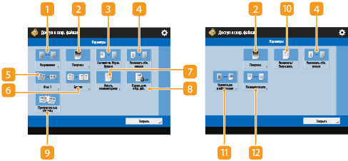 Нажмите этот значок, чтобы зарегистрировать текущие параметры в разделе <Часто исп. параметры>, который открывается нажатием кнопки , или чтобы изменить заводские параметры печати по умолчанию.
