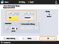 Om du vill placera bildformen utan att justera tätheten, tryck på <Fast>. Om du vill placera bildformen med minskad täthet, tryck på <Transparent> för att justera tätheten.