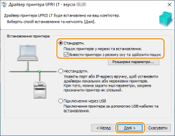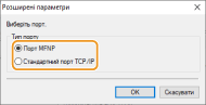 1 | Виберіть [Стандартн.], встановіть прапорець [Вивести принтери з режиму сну та здійснити пошук] та клацніть [Далі]. Якщо ви використовуєте принтер у середовищі IPv6, клацніть [Розширені параметри] виберіть [Стандартний порт TCP/IP] клацніть [OK].![]() ![]() Про [Розширені параметри] Можна вибрати тип порту. ![]() [Порт MFNP] (лише для середовища IPv4) Це порт, що дозволяє здійснювати автоматичне визначення IP-адреси принтера. Навіть у випадку змінення IP-адреси принтера з’єднання між принтером та комп’ютером зберігатиметься, якщо вони відноситимуться до однієї підмережі. Тому вам не потрібно буде додавати новий порт щоразу, коли ви змінюєте IP-адресу. Якщо принтер використовується в середовищі IPv4, виберіть це налаштування. [Стандартний порт TCP/IP] Це стандартний порт Windows. При кожному зміненні IP-адреси принтера необхідно додавати новий порт. | |