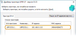 2 | Встановіть прапорець навпроти принтера, який необхідно встановити, зі списку [Список принтерів]. Якщо принтер використовуватиметься в середовищі IPv6, перейдіть на вкладку [Пристрої IPv6]. ![]() ![]() Якщо відображається екран [Процес вибору] Якщо драйвер принтера вже встановлено, відкриється екран [Процес вибору] перед екраном [Виберіть принтери, які потрібно встановити]. Для вашого принтера зроблений вибір не впливає на процедуру налаштування. Просто клацніть [Далі]. ![]() Якщо вкладка [Пристрої IPv6] не відображається Поверніться до попереднього екрана та клацніть [Розширені параметри] виберіть [Стандартний порт TCP/IP]. Якщо потрібний вам принтер не відображається в розділі [Список принтерів] Проблеми, пов’язані з дротовою або бездротовою локальною мережею | |