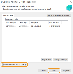 3 | Встановіть прапорець [Введіть відомості про принтер] і виберіть [Далі]. ![]() | |