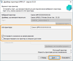 4 | Задайте необхідну інформацію та клацніть [Далі]. ![]() [Ім’я принтера] Відповідним чином змініть ім’я принтера. [Установити значення за замовчуванням] Встановіть прапорець, якщо ви бажаєте використовувати ваш принтер у якості принтера за замовчуванням. [Використовувати як принтер зі спільним доступом] Встановіть прапорець, якщо необхідно надати спільний доступ до принтера (використовуючи комп’ютер у тих випадках, коли ви виконуєте встановлення в якості сервера друку). Налаштування сервера друку під час встановлення драйвера принтера | |