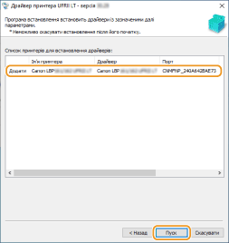 5 | Перевірте дані принтера в розділі [Список принтерів для встановлення драйверів] та клацніть [Пуск]. ![]()
