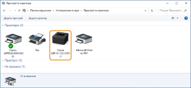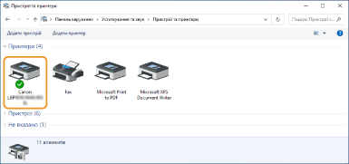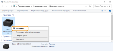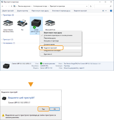 Видалення непотрібних піктограм принтераПісля завершення встановлення мережевого принтера, піктограма, додана на кроці 13 процедури Встановлення драйвера принтера, більше не потрібна. Щоб видалити піктограму, клацніть її правою кнопкою миші та виберіть [Видалити пристрій] або [Видалити]  клацніть [Так]. |