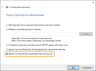 Виберіть [Додати локальний або мережевий принтер вручну] або [Додайте локальний принтер] та натисніть [Далі].