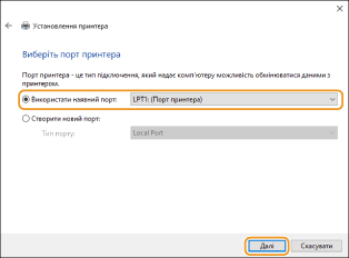 Переконайтеся, що встановлено прапорець [LPT1] у розділі [Використати наявний порт:], та натисніть [Далі].