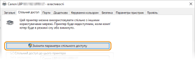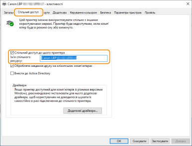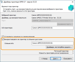 [Використовувати як принтер зі спільним доступом] Якщо встановлено цей прапорець, комп’ютер, на який встановлюється драйвер принтера, буде призначено в якості сервера друку. [Спільне ім'я] Введіть ім’я спільного принтера. [Драйвери, які потрібно додати] Клацніть, щоб встановити додаткові драйвери. Під час процедури, описаної в розділі Встановлення драйверів через сервер друку (налаштування клієнта), додаткові драйвери є необхідними, якщо ви плануєте використовувати сервер друку для встановлення драйверів принтера на комп'ютери з різними версіями процесорів (32-розрядною або 64-розрядною) операційної системи. |