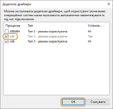 2 | Виберіть додаткові драйвери й натисніть [OK]. ![]() Виберіть додаткові драйвери відповідно до операційної системи сервера друку, як описано нижче.