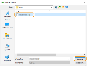 5 | Зазначте папку, в якій зберігаються додаткові драйвери, виберіть файл Inf та натисніть [Відкрити]. ![]() Зазначте папку, в якій зберігаються додаткові драйвери, як описано далі.