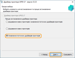 Виберіть [Оновлення поточних драйверів принтерів] та натисніть [Далі].