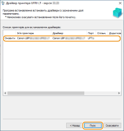 Перевірте дані принтера в розділі [Список принтерів для встановлення драйверів] та клацніть [Пуск].