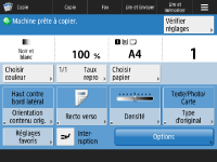 Dans l'écran <Accueil>, appuyez sur les touches de fonctions pour afficher l'écran Fonctions de base, qui vous permet d'accéder aux fonctions élémentaires comme la copie, la télécopie et la numérisation. L'affichage et les éléments de paramétrage de l'écran Fonctions de base diffèrent selon les fonctions ; néanmoins, vous pouvez modifier les paramètres au gré de vos besoins. Personnalisation de l'écran des fonctions de base