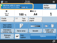 Affiche l'état des réglages, comme l'agrandissement, le format papier et le nombre de copies. Veillez à vérifier les réglages afin de copier correctement. Pour modifier les réglages, appuyez sur le bouton sous la section affichage.