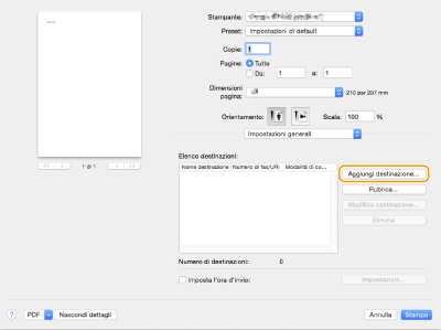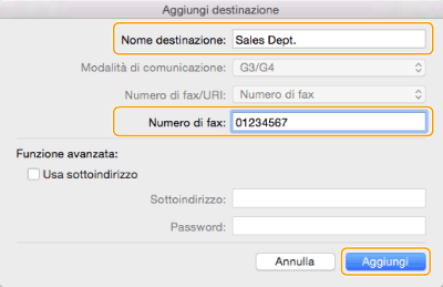 Inserire il nome di destinazione in [Nome destinazione] e il numero di fax in [Numero di fax], quindi fare clic su [Aggiungi]