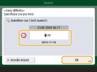 | | È possibile effettuare la scansione degli originali in anticipo e inviarli ad un'ora specificata. |