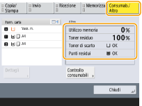 È possibile verificare la quantità residua di materiale di consumo tramite IU remota. Verifica dello stato della macchina |