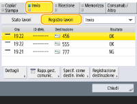 Quando un documento viene inviato o salvato correttamente, <OK> appare nella colonna <Risultato>. Se viene visualizzata l'opzione <NG> non è stato possibile inviare o salvare un documento a seguito di annullamento o a causa di un errore.