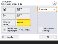 1 | Selezionare <OOXML> selezionare<PowerPoint> dall’elenco a discesa.![]() ![]() Per modificare la lingua utilizzata per OCR, premere <Impostazione dettagli> <Cambia> selezionare la lingua premere <OK>. |