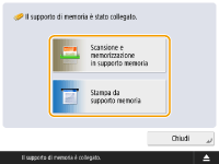 Visualizzazione di una scelta rapida per accedere alle funzioni disponibili quando è inserito un supporto di memoriaImpostare <Selez. opzione quando si collegano supporti memoria> su <On>. Quando è inserito un supporto di memoria, viene visualizzata una schermata come la seguente e le funzioni corrispondenti possono essere eseguite immediatamente. <Selez. opzione quando si collegano supporti memoria>*Per visualizzare le scelte rapide, inserire il supporto di memoria dopo aver annullato il modo riposo. Uscita dal modo riposo |