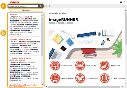Klicken Sie auf diese Option, um Informationen zur Anzeige der Anwenderhandbuch zu lesen, wie eine Suche durchgeführt wird und andere Informationen.