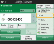 So überprüfen Sie die Gesamtanzahl der angegebenen EmpfängerDie Gesamtanzahl der angegebenen Empfänger wird oben am Bildschirm angezeigt. Dadurch können Sie vor dem Senden überprüfen, ob die Anzahl der Empfänger korrekt ist. ![]() So senden Sie ein Fax mit AbsenderinformationenSie können den Namen und die Faxnummer des Absenders beim Senden angeben. <Kopfzeile SE> So zeigen Sie den Status für gesendete Dokumente anAuf dem Bildschirm <Statusmonitor> können Sie den Status für gesendete Dokumente anzeigen. Auf diesem Bildschirm können Sie Faxnachrichten erneut senden oder das Senden nach dem Prüfen des Status abbrechen. Überprüfen von Status und Log für gesendete und empfangene Dokumente Wenn <Benachricht.anzeigen, wenn ein Auftrag akzeptiert ist> auf <Ein> gestellt wird, kann der <Statusmonitor>-Bildschirm über folgenden Bildschirm angezeigt werden, der nach Empfang eines Sendeauftrags eingeblendet wird. <Benachricht.anzeigen, wenn ein Auftrag akzeptiert ist> ![]() Wenn ein Übertragungsfehler auftritt, weil die Leitung des Empfängers belegt istNach einer bestimmten Wartezeit wird eine automatische Wahlwiederholung durchgeführt. Sie können unter anderem ändern, wie oft die Wahlwiederholung stattfindet, und das Intervall zwischen den Wahlwiederholungen einstellen. <Auto Wahlwiederholung> So drucken Sie den Bericht mit den SendeergebnissenWenn Sie auf der Anzeige für Grundeigenschaften des Faxens auf <Optionen> <SE Ergebnisbericht> drücken, können Sie festlegen, dass der Bericht mit den Sendeergebnissen automatisch gedruckt wird.Um dies für jeden Auftrag von <Optionen> einzustellen, müssen Sie <Nur bei Fehler> oder <Aus> in <SE Ergebnisbericht> wählen und dann <Drucken über Optionen zulassen> auf <Ein> einstellen. Wenn Fotos im gesendeten Bild zu dunkel sind oder helle Farben im Hintergrund von farbigen Originalen nicht entfernt werden können.Die Qualität des gesendeten Bildes kann möglicherweise verbessert werden, wenn die folgenden Bedingungen/Einstellungen erfüllt sind. Auftragsart: Fax (Speicher senden) oder Scannen und Senden (Fax/I-fax) <Farbe wählen>: <Schwarzweiß> (Scannen und Senden) <Originaltyp>: <Text> <Dichte> <Hintergrunddichte>: <Auto><Auflösung>: 200 dpi x 400 dpi, 300 dpi x 300 dpi*, 400 dpi x 400 dpi, oder 600 dpi x 600 dpi* * Kann für „Scannen und Senden“ eingestellt werden <Vorrang Geschwindkeit/Bildqualität für SW-Scan> Fax/I-Fax Sendeaufträge: <Vorrang Qualität> (<Vorrang Geschwindkeit/Bildqualität für SW-Scan>) |
