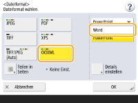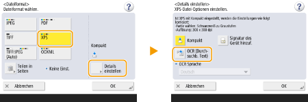 Wenn Sie <PDF> oder <XPS> als Dateiformat auswählen, können Sie <Kompakt> und <OCR (Durchsuchbarer Text)> zeitgleich festlegen. In diesem Fall wird <PDF; Kompakt> oder <XPS; Kompakt> als Dateiformat im Grundfunktionsbildschirm für Scannen und Senden angezeigt.
