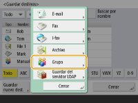 ![]() | Varios destinos registrados en la Libreta de direcciones (Registro de destinos en la libreta de direcciones) se pueden combinar en un grupo. Puede utilizar esta función para enviar documentos y hacer copias de seguridad de datos al mismo tiempo, porque se pueden registrar distintos tipos de destinos en el mismo grupo. Por ejemplo, puede registrar direcciones de correo electrónico y direcciones IP del servidor de archivos conjuntamente en un grupo. |