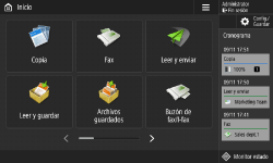 Pulse , que aparece en la pantalla de <Inicio> y en la pantalla Funciones básicas, para personalizar la pantalla, reorganizando botones o creando una tecla de acceso directo. Personalizar la pantalla táctil![]() Puede cambiar las opciones de visualización en pantalla, como por ejemplo la pantalla que aparece justo después de encender el equipo, y si aparece el mensaje de papel y tóner restantes. <Opciones de visualización> Puede establecer qué pantalla debe mostrarse cuando haya transcurrido un tiempo sin que se realice ninguna operación. <Función tras reinicio automático> |
