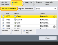 Si selecciona un documento y pulsa <Cancelar>, podrá cancelar el envío. No puede seleccionar varios trabajos y cancelarlos todos a la vez. Seleccione y cancele un trabajo cada vez.