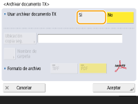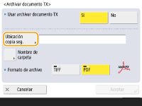No puede realizar un Envío directo si establece <Archivar documento TX> en <On> Esta opción cambia automáticamente a <No> en los siguientes casos. Especifique el destino de nuevo o vuelva a poner la opción en <Sí> según corresponda. Cuando el destino de la copia de seguridad se ha eliminado de la libreta de direcciones Cuando se ha importado una libreta de direcciones desde la IU remota Importar/exportar datos de configuración Cuando se ha recibido una libreta de direcciones desde el software de administración de libretas de direcciones. <Importar/Exportar desde software gestión libr. direcc,> |