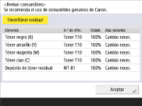Puede consultar la cantidad restante de consumibles desde la IU remota. Consultar el estado del equipo |