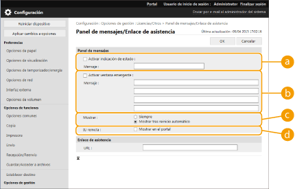 Cancelar la visualización de mensajesQuite la marca de las casillas de verificación de [Activar indicación de estado], [Activar ventana emergente] y [IU remota]. Si también desea eliminar el contenido del mensaje, quite el texto introducido en los cuadros de texto de [Mensaje]. |